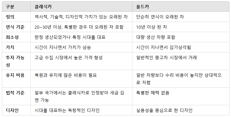✅ 클래식카는 시간이 지나면서 희소성이 증가하며, 투자 가치가 있는 반면, 올드카는 주로 실용적인 가치에 머무른다.
